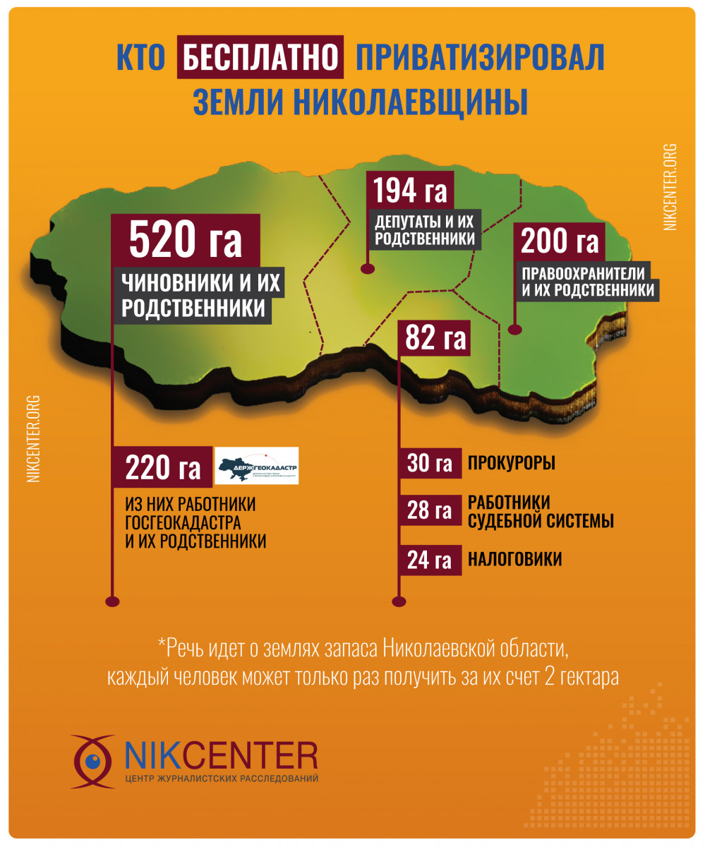 Однако особенно отличились чиновники местных управлений Госгеокадастра в Николаевской области. За два года они вместе со своими родственниками приватизировали более 220 га.
