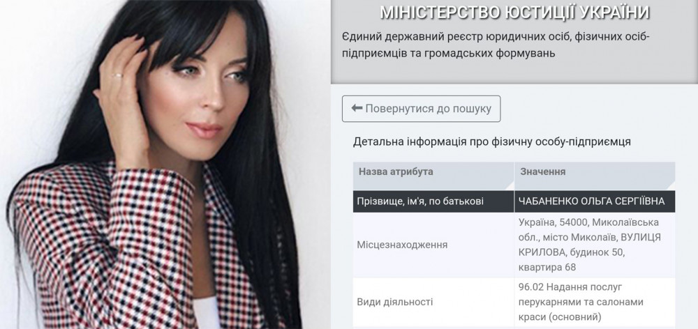 Успешная агробизнеследи Ольга Чабаненко с 2017 и до 2021 года была зарегистрирована как предприниматель с основным видом деятельности “услуги парикмахерских и салонов красоты”. В мобильном приложении Getcontact ее номер подписан как “Оля Брови”.
