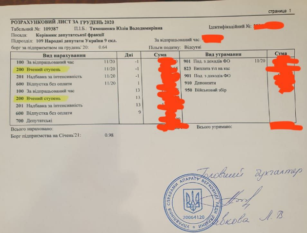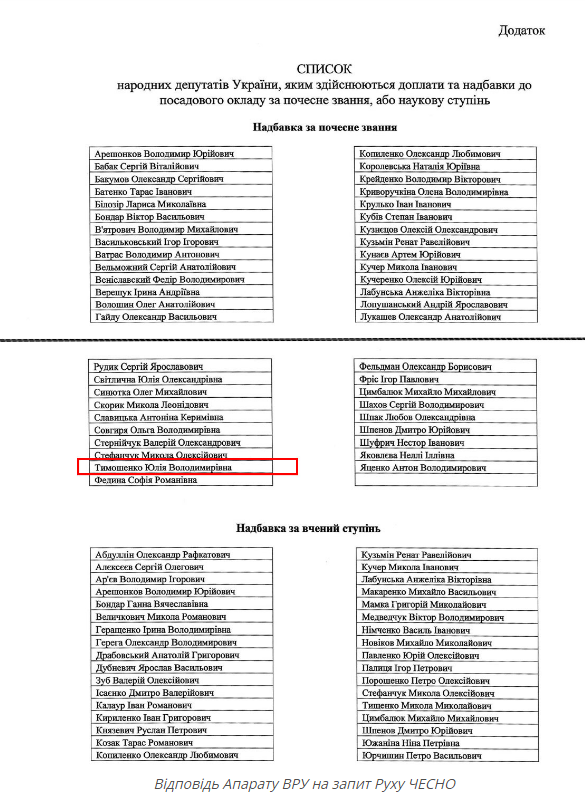 Після публікації цієї статті, до редакції Руху ЧЕСНО звернулася прес-служба фракції і повідомила, що лідерка партії отримує надбавку, як кандидатка наук. На підтвердження своїх слів, надали зарплатну відомість (додано).