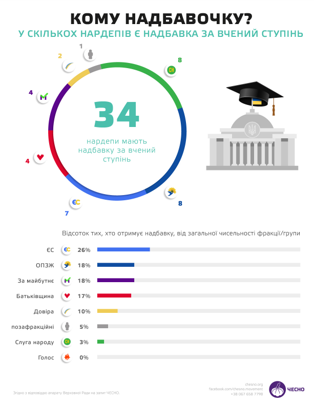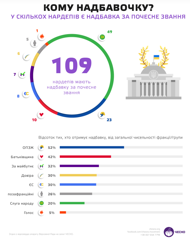Крім того, у Верховній Раді цього скликання є депутати, які отримують надбавки і за почесне звання, і за вчений ступінь. Більшість із них представники фракції ОПЗЖ, зокрема нардеп Тарас Козак є кандидатом економічних наук та заслуженим економістом України, Юрій Павленко — заслужений працівник фізичної культури і спорту та кандидат філософських наук, колишній суддя КСУ і теперішній депутат Василь Німченко — заслужений юрист України та кандидат юридичних наук.