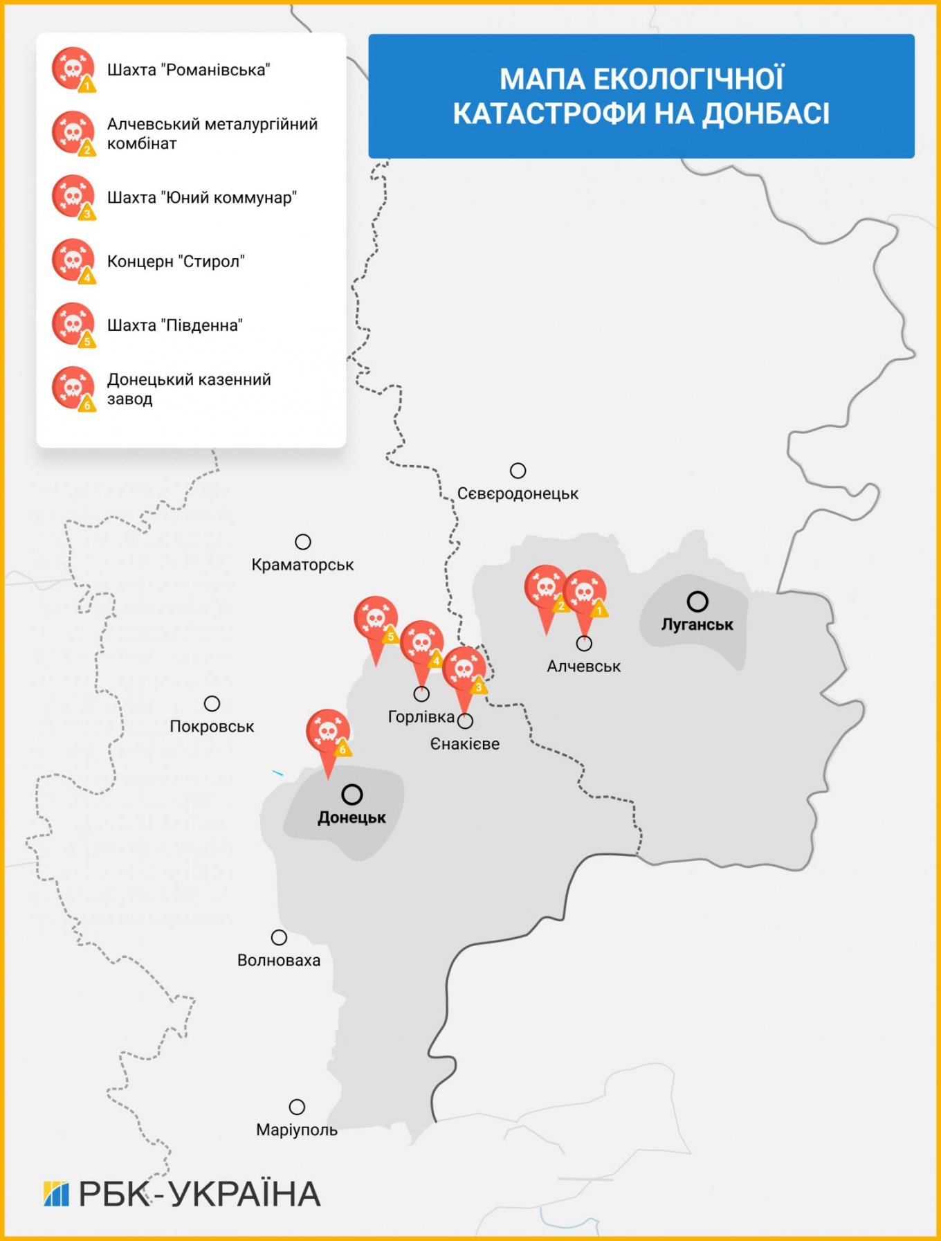 Объекты повышенной опасности также находятся в городах Новолуганское, Авдеевка, Мариуполь и Торецк. Однако пока радиационный фон там в пределах нормы, уточнил глава ДЭИ.