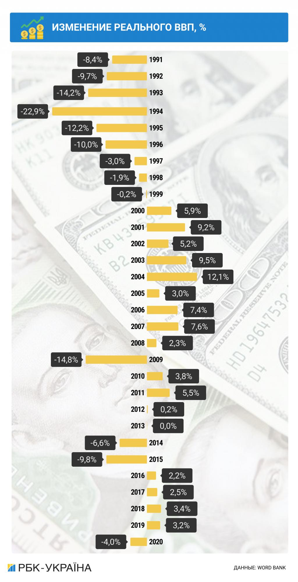 По данным ВБ, валовый внутренний продукт Украины в 1991 году достиг 188,5 млрд долларов (в постоянных ценах 2010 года). Через 30 лет это только 130 млрд долларов. К 2020 году доля Украины в мировом ВВП сократилась в три раза с 0,49% до 0,16%.