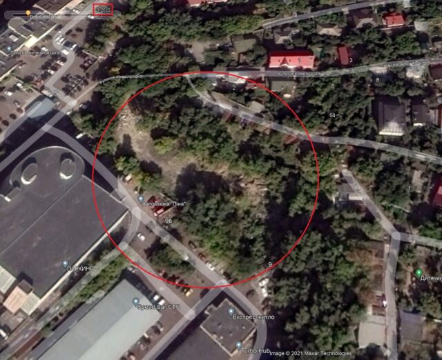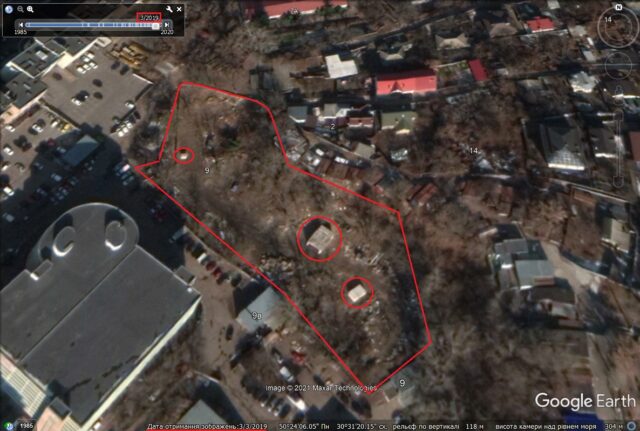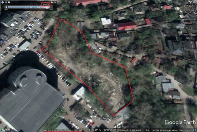Ці три споруди були збудовані лише на початку 2019 року. Це чітко видно за даними Google Earth. Ось знімок за вересень 2018 року, коли ділянка на вул. Голосіївській, 13-Д вільна від забудови.