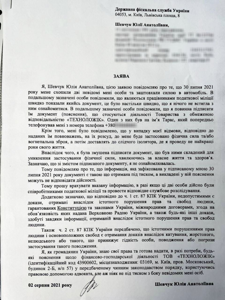 «Заштовхали мене в автомобіль. Сказали, що є працівниками податкової поліції. Виглядали вони нормально, але говорили як бандити. Швидко показали якийсь документ, я не встигла його розглянути. Почали мені погрожувати, щоб я підписала – якесь пояснення про діяльність ТОВ «Технолоджік». Якщо відмовлюсь – погрожували застосувати до мене фізичну силу або вогнепальну зброю. Обіцяли «веселе» життя в слідчому ізоляторі», - пригадує Юлія Шевчук.
