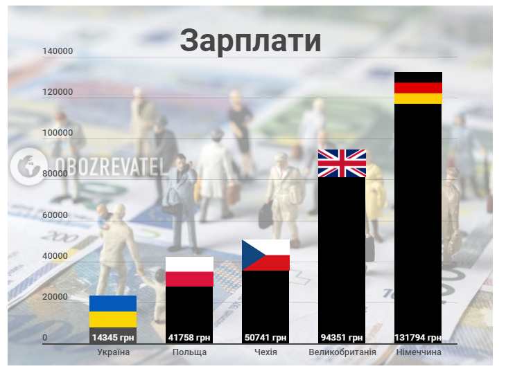 К примеру, в то время как средняя зарплата в Польше составляет почти 42 тыс. грн, украинцам на самой популярной вакансии для заробитчан "упаковщик" предлагают от 25 до 35 тыс. грн. В Германии в большинстве вакансий для заробитчан указывают зарплату от 50 до 70 тыс. грн, тогда как средний заработок в этой стране превышает 131 тыс. грн.