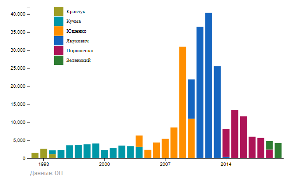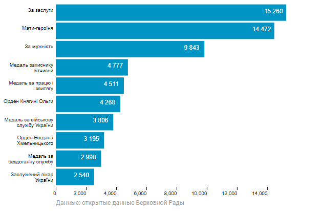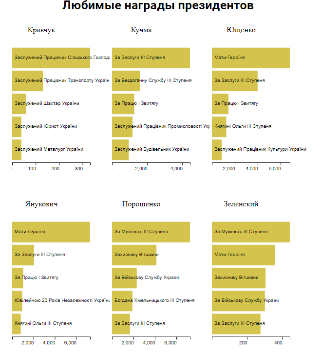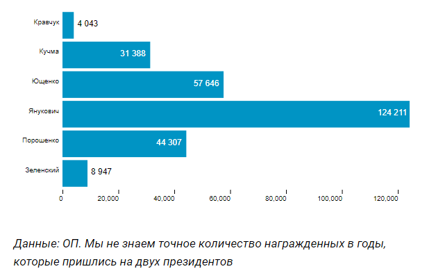 По наградам также легко отследить, как менялись приоритеты государства. Леонид Кравчук наградил всего 4000 человек, и в указах на сайте ВР чаще всего фигурируют награды для "трудящихся" – заслуженные работники сельского хозяйства, транспорта, шахтеры и юристы. При Кучме уже начали вручать ордена "За заслуги" и "За труд", а при Ющенко и Януковиче начался бум по вручению многодетным матерям почетного звания "Мать-героиня". С началом войны приоритет в наградах логично изменился на военных – "За мужество" и "Защитнику отечества".