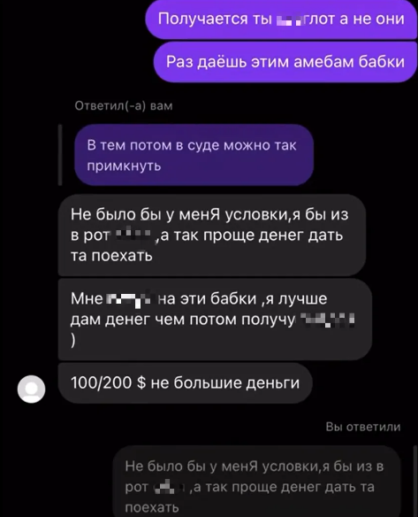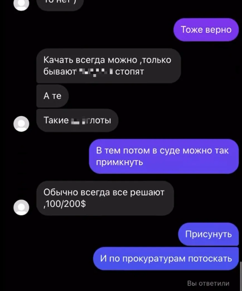 "Обычно всегда все решают 100/200 долларов. Не было бы у меня условки, я бы их в рот ****, а так проще денег дать та поехать. Мне **** на эти бабки, я лучше дам денег, чем потом получу ****", – признается парень.