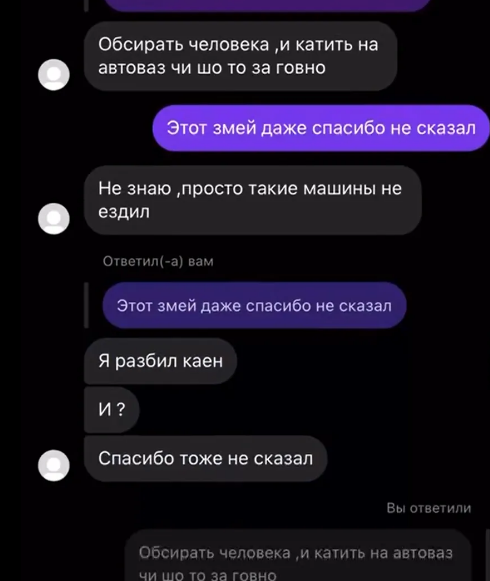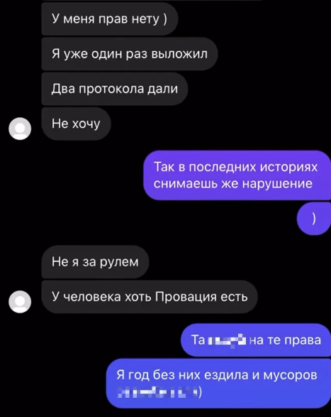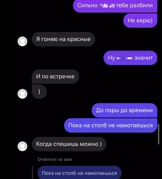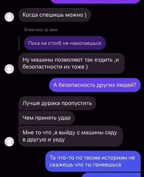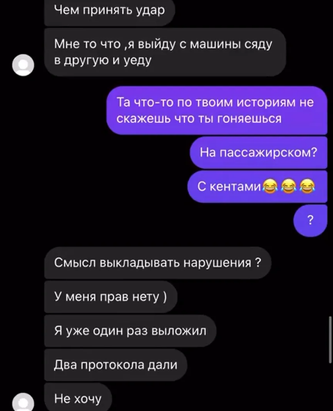 "Мне разбили каен. Форд, додж, камри... Я гоняю на красные и по встречке... Мне то что. Я выйду из машины, сяду в другую и уеду", – пишет виновник аварии.