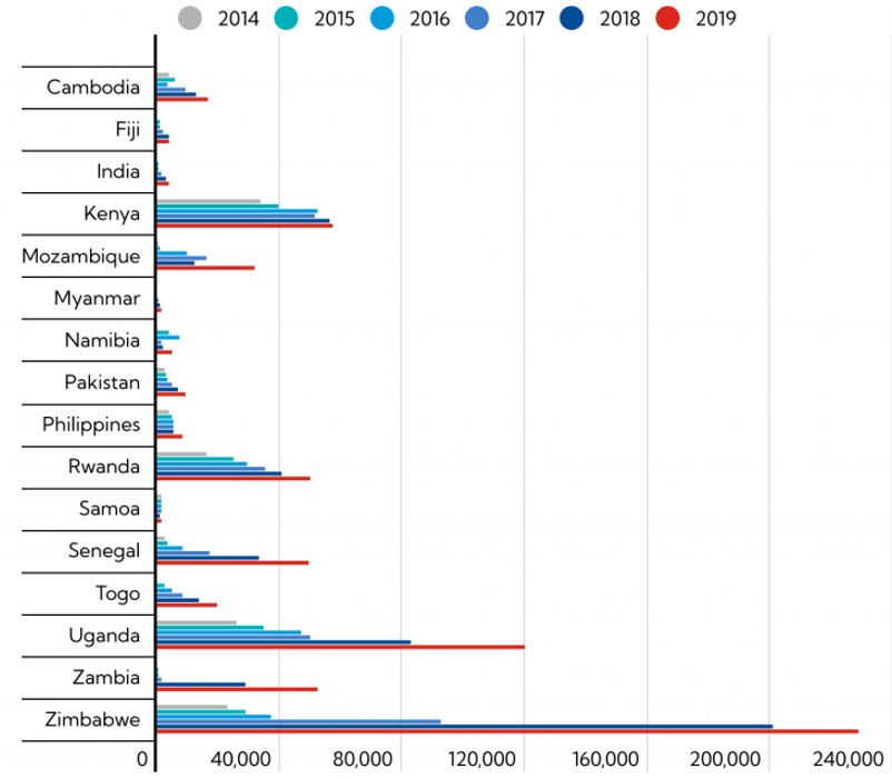 По оценкам, две трети совокупного взрослого населения Кении (где M-PESA достигла высокого уровня распространения на рынке), Руанды, Танзании и Уганды регулярно пользуются электронными деньгами. Многие из этих людей не имеют банковского счета или других способов доступа к официальной финансовой системе, поэтому они хранят значительную долю своих располагаемых средств в электронных кошельках и пользуются ими с помощью мобильных телефонов или компьютеров.