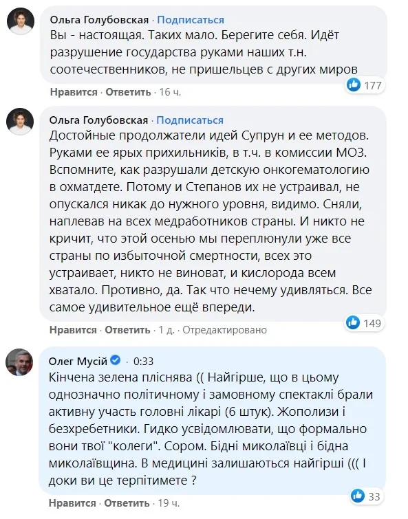 У коментарях під дописами по цій темі головний інфекціоніст дорікнула керівництву МОЗ, що вони - гідні продовжувачі ідей Супрун та її методів. Вона наголосила, що цієї осені в Україні була надлишкова смертність, тому що кисню вистачало лише на паперах.