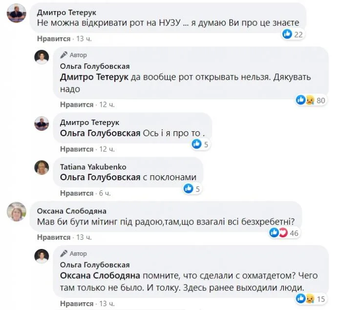 «Щось зовсім нездорове з вами усіма відбувається. А за так званих колег, які в цьому беруть участь, мені взагалі соромно. І за тих, хто з «комісії Міністерства охорони здоров'я» без жодного інфекціоніста, та місцевих», - написала Голубовська.