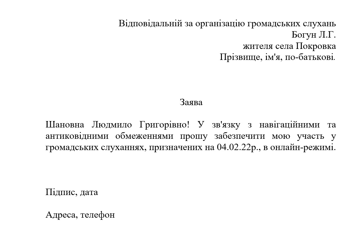 - Предоставить свои данные и образец подписи, отправить на адрес [email protected] или в Viber (телефон +380675151505). Заявление будет оформлено и отправлено от имени соответствующего жителя с указанного адреса электронной почты.