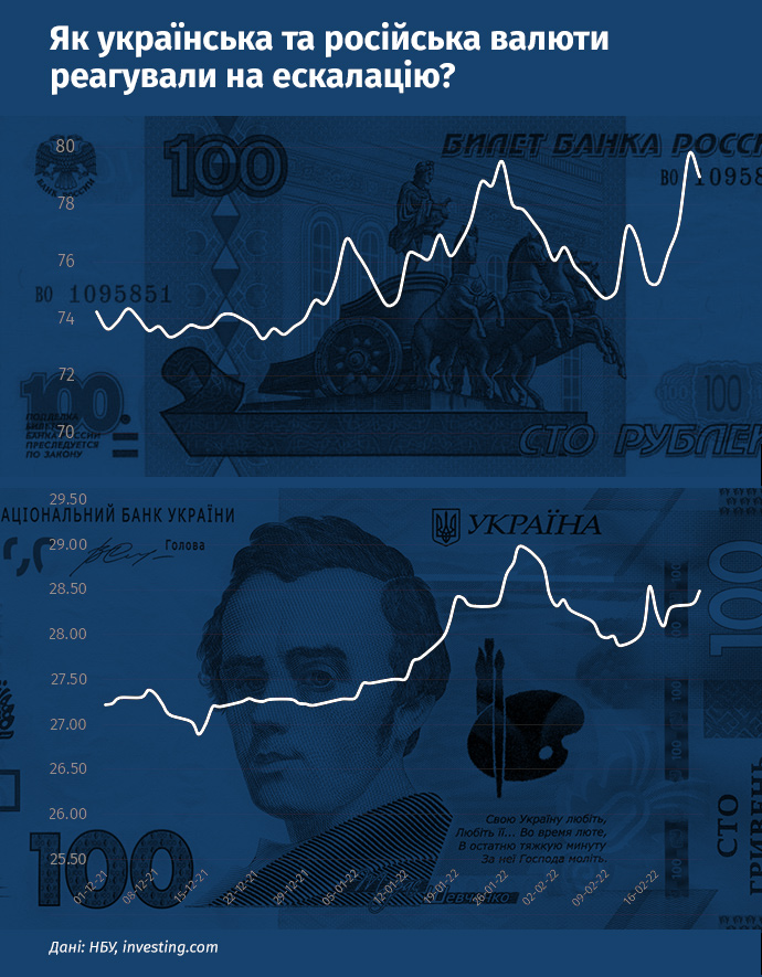 Економіка країни-агресора також страждає від ескалації. Різкого обвалу 21 лютого зазнав російський рубль, але на наступний день частково відіграв падіння.