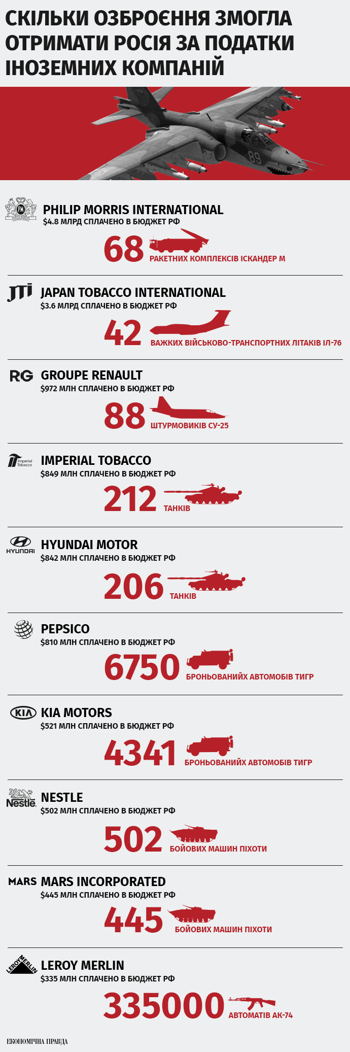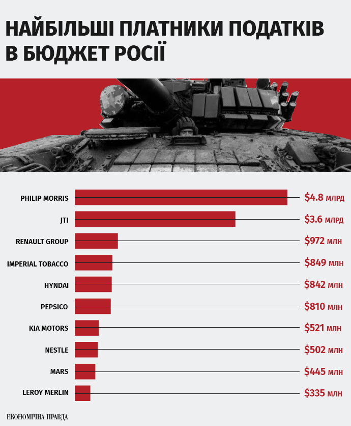 РФ тратит на армию около 15% госбюджета и еще больше – на поддержку диктаторского режима. Таким образом, когда эти компании платят налоги в российский бюджет, они финансируют вооруженные силы и обстрелы украинских городов.