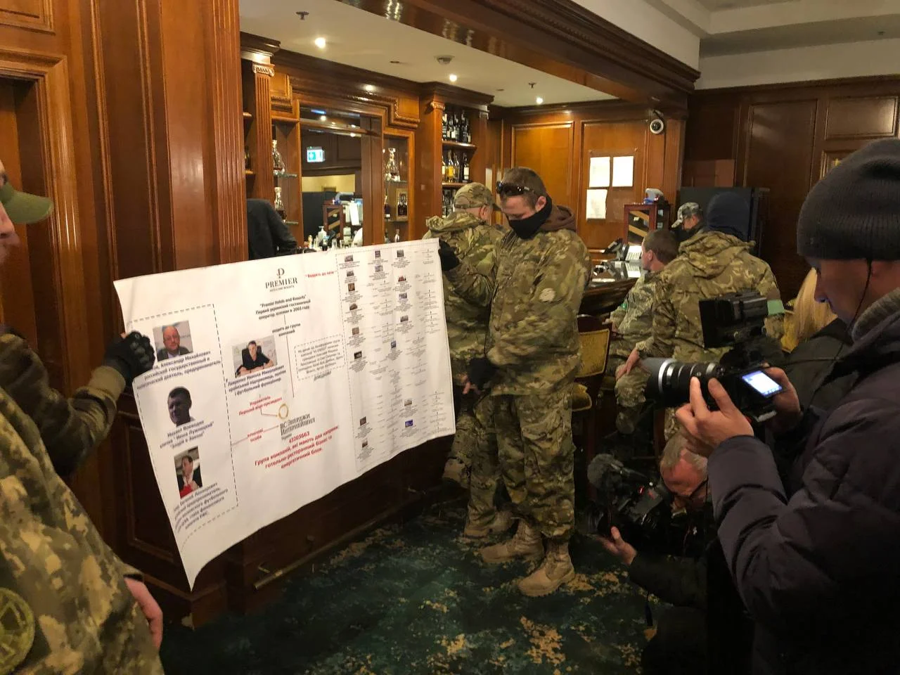 От имени украинских защитников (все они присоединились к территориальной обороне), которые пришли в гостиницу помочь национализировать бизнес, принадлежащий друзьям Путина, выступил Василий Мягкий. Он рассказал о фактических бенефициарах этого гостиничного бизнеса и объяснил, что пока в Украине работает бизнес, который финансирует российский терроризм, они помогают государству с обнаружением такого имущества. Конечная цель - официальная передача этого отеля и других в собственность государства.