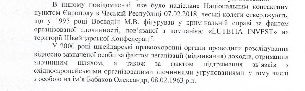 В распоряжении редакции есть ответ от Национальной полиции на запрос о предоставлении информации о Воеводине. В документе идет речь о том, шлейф криминальных достижений Воеводина тянется вплоть до Швейцарии, в делах фигурирует вышеупомянутый Александр Бабаков.