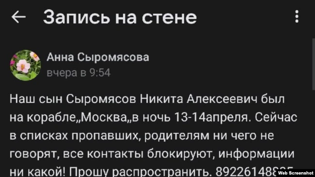 Житель Ялты Дмитрий Шкребец, который ранее сообщил об исчезновении на крейсере «Москва» своего 20-летнего сына-срочника Егора, на своей странице ВКонтакте публикует новые данные о пропавших без вести после затопления «Москвы». Шкребец опубликовал пост пользовательницы Анны Сыромясовой, которая сообщила, что «Никита Алексеевич Сыромясов был на крейсере «Москва» в ночь 13-14 апреля», после чего попал в списки пропавших без вести. «Родителям ничего не говорят, все контакты блокируют. Информации никакой», – написала Анна Сыромясова.