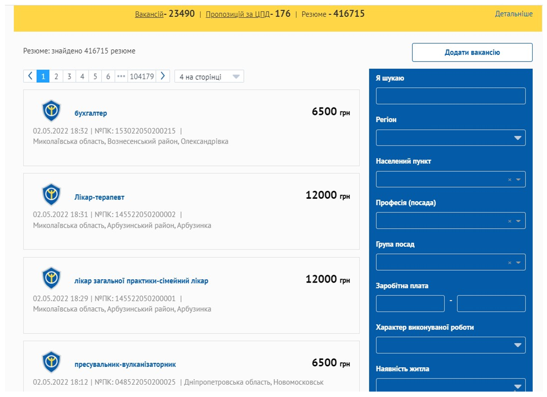 Перша сторінка вакансій на сайті Державного центру зайнятості (Джерело: сайт Державного центру зайнятості)