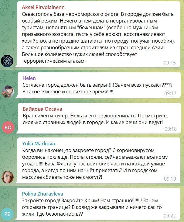 Схоже, що у окупантів починається паніка. У російських телеграм-каналах в коментарі налетіли боти, які вимагають закрити місто. Мовляв, Севастополь - база Чорноморського флоту, тому у місті має бути особливий режим: нема чого в ньому робити неорганізованим туристам, незрозумілим "біженцям", та ще й у "такий важкий та серйозний час". Ще кажуть, що їм страшно, а українці - сильні і хитрі.