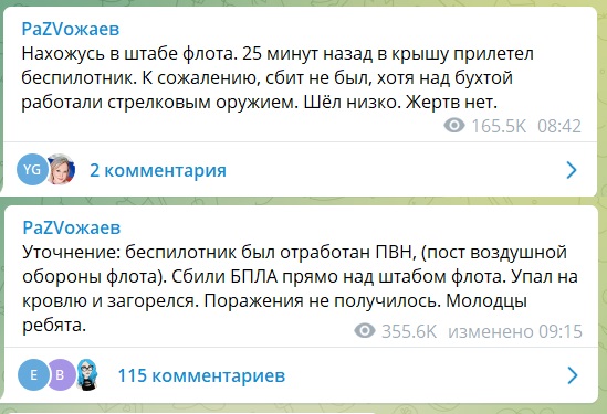 Водночас гауляйтер Севастополя Міхаіл Развожаєв спочатку визнав, що безпілотник російським військовим не вдалось збити, а вже за півгодини спростував свої ж слова. Він також показав дах будівлі Чорноморського флоту, до якого влетів безпілотник — серйозних руйнувань "немає".