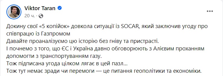 "Докину свої "5 копійок" довкола ситуації із Socar, який заключив угоду про співпрацю із "Газпромом". Давайте проаналізуємо цю історію без гніву та пристрасті. І почнемо з того, що ЄС і Україна давно обговорюють з Алієвим проханням допомогти з транспортуванням газу. Тож підписана угода цілком лягає в цей пазл… Тож тут немає зради чи перемоги — це питання геополітики та економіки", - так пояснює співпрацю Socar із "Газпромом" політтехнолог, керівник Центру підготовки операторів БПЛА "Крук" Віктор Таран.