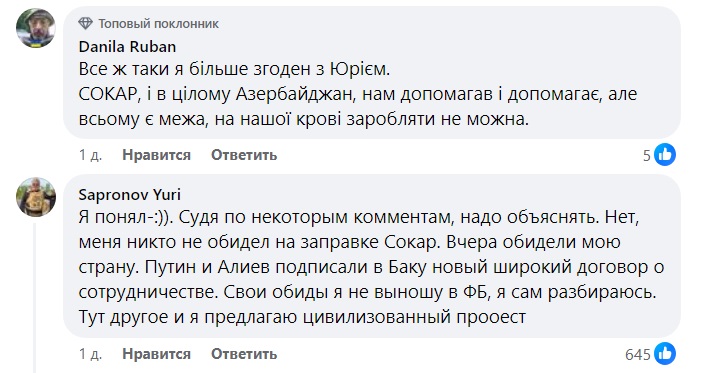 "Я розумію, що війна звужує наш життєвий простір і накладає серйозні обмеження на багато звичних речей і контактів. Але після цього облизування просто не зможу залишити жодної копійки азербайджанському паливному оператору. Принаймні, до з'ясування реальних мотивів президента Ільхама Алієва, який приймав російського вбивцю Владіміра Путіна як... брата. Чи дорогого гостя. Я розумію, що "схід – справа тонка". І, можливо, за цими обіймами приховано якийсь план протидії експансії Росії в регіоні. Можливо. Подивимось. А поки-що ні, жодної копійки азербайджанським заправкам Socar".