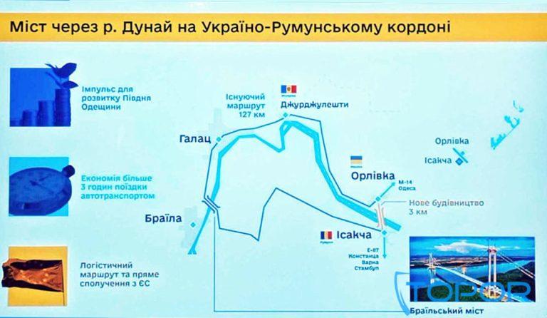 Що стосується мосту через Дунай в районі населених пунктів Орлівка-Ісакча (Румунія), то його довжина може скласти близько 800 м. з підходами до 12 км. Проте, це не точна інформація.