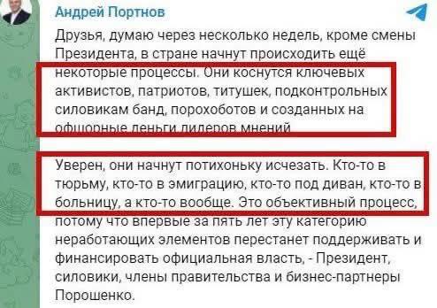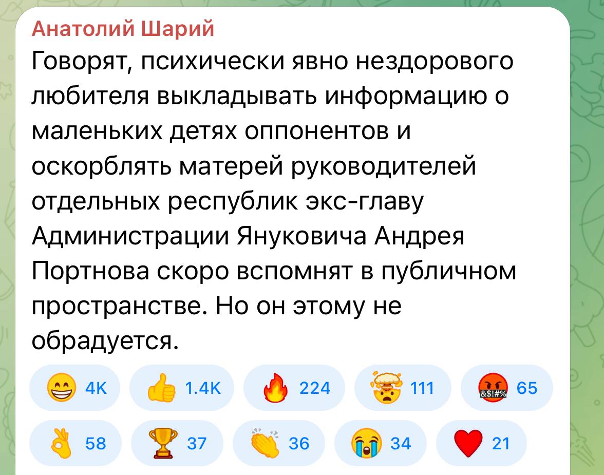 «Убивство Андрія Портнова – це з ймовірністю 99% Зеленський готується до виборів. Погрози вбивством від Офісних каналів (телеграм-каналів, підпорядкованим Офісу президента, - Ред.), які тут же пішли на мою адресу та адресу Анатолія Шарія, можлива погроза Олексію Гончаренку, показує задум: позбавити можливих «лідерів» так званий електорат «ОПЗЖ», - заявив колишній радник ОП, який виїхав з України у вересні 2023 року і зараз переховується в США.