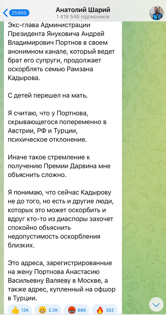 «Раніше він зливав його адреси Кадирову і натякав, що про Портнова незабаром згадають, але він цьому не зрадіє», - пригадав Казанський.