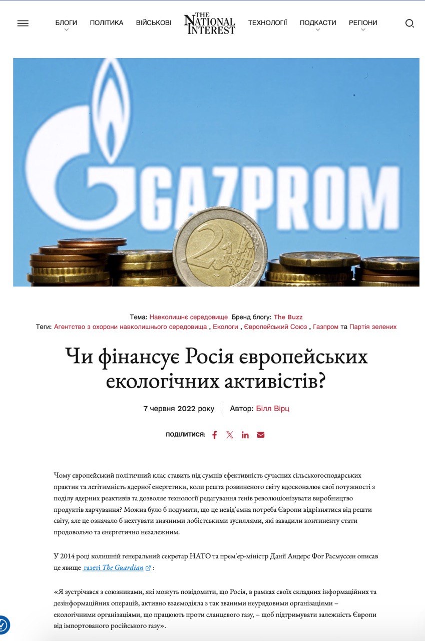 Як відомо, російські монополісти фінансують екологічні ініціативи в багатьох куточках світу, щоб не втрачати надприбутки від торгівлі вуглеводнями. Відомо, що вони через фонд, пов’язаний з NordStream проводили фінансування німецьких екологічних організацій WWF (саме час згадати, що її крило WWF-Україна є великим другом «Екосфери»), BUND (Друзі Землі) та NABU (Асоціація охорони природи та біорізноманіття). А ті, в свою чергу, перекидають гроші українським екологам, зокрема через фонди, пов’язані з Медведчуком.