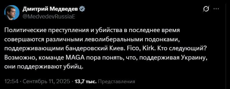 Рупор Путіна Дмітрій Мєдвєдєв заявив, що всі, хто підтримує Україну, підтримують вбивць, які робили замах на Фіцо і вбили Чарлі Кірка. А ще застерів команду МАГА "не підтримувати убивць".