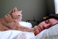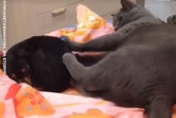 Кот пытается спихнуть маленького пса с кровати (видео)