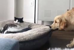 Пес изо всех сил пытается согнать кота с кроватки (видео)
