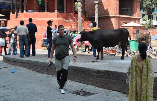 | На фото: У меня за спиной отель, о котором в 1954 году журнал «Life» сообщил: «Борис Лисаневич, британский подданный русского происхождения, сумел взять в аренду дворец в Катманду и переоборудовать его в Royal Hotel. Всё оборудование ‑ от кастрюль до смывного туалета ‑ было доставлено самолётами». |