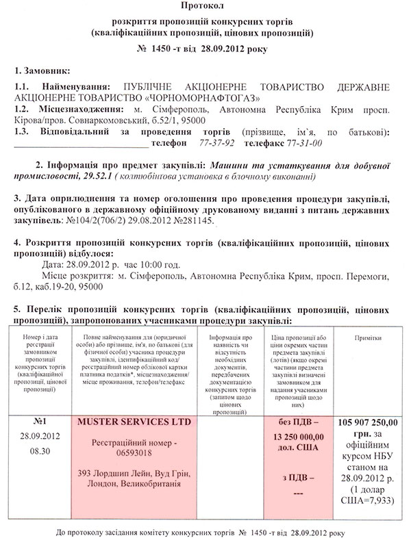 Аналогічне колтюбінгове устаткування так само в морському виконанні ще в часи Януковича, у 2012 році було предметом тендеру в державній компанії "Чорноморнафтогаз". І переможцем того тендеру стала фірма Muster Services Limited, яка... зареєстрована за тією ж адресою в Лондоні, між продажем пральних машин та матраців, в будинку N393 на вулиці Lordship Lane. А директором також була кіпріотка... Георгіна Папапетроу. І вона ж була номінальним акціонером тієї фірми.