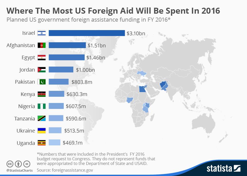 Администрация Обамы запросила Конгресс выделить в бюджете на 2016 финансовый год $37.9 млрд иностранной помощи, большая часть которого достанется правительствам стран на Ближнем Востоке. Президент поручил выделить наибольший объем помощи для Израиля — $3.1 млрд. Он также просит $1.5 млрд для Афганистана в поддержку проектов в области безопасности и восстановления, $1.46 млрд для Египта и $0.514 для Украины.