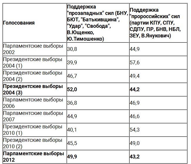 Два случая победы "прозападных" ("проукраинских") сил (из девяти) показывают, насколько они не могли гарантировать устойчивого успеха. Первый раз это произошло в результате второго дополнительного (третьего) тура президентских выборов 2004 года благодаря беспрецедентной мобилизации гражданского общества в ходе Оранжевой революции и балансирования страны на грани жесткого гражданского противостояния.