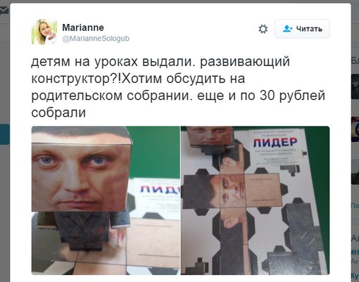 Несколько дней назад стало известно о якобы развивающих конструкторах для детей, проживающих в «ДНР». Смешно глядеть не только на название конструктора «лидер», которое созвучно с более подходящим Александру Захарченко нецензурным словом при смене первой буквы, но и на самого кубоголового лидера псевдореспублики. Хотя подобное проявление культа личности уже не удивляет после того, как было организовано движение «захаровцев» по подобию пионеров. Печально, что из детей вырастут деформированные личности, для которых образцом успешного человека будет Александр Захарченко.