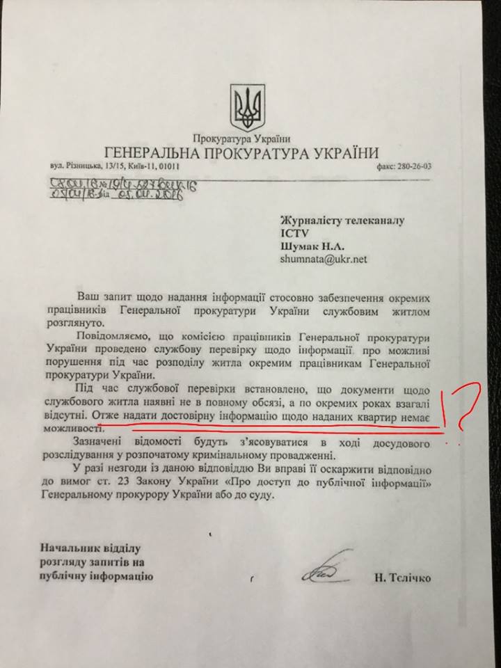 В ответ - какой- то маразм!! То документы украли, то их потеряли, то "десь само вкралося"... Никогда не поверю, что нельзя навести порядок с учетом выданных квартир. Цена ведь каждой из них не меньше миллиона! И вот пока будут приходить в редакцию вот такие вот корявые отписки, можно быть уверенным- ничего в ближайшем будущем не изменится. Приближенные к начальству дармоеды будут за государственный счет получать бесконтрольно жилье. А честные и порядочные прокуроры будут ютиться со своими семьями в крохотных хрущевках. И в конце концов либо плюнут и уйдут обслуживать бизнесменов, либо , ради выживания, вынуждены будут брать взятки и множить коррупцию. Это ж очевидно, как божий день!