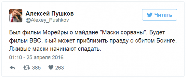 Больше всех клоуном выглядит Алексей Пушков, председатель комитета Госдумы по международным делам. Он одним из первых отреагировал на новость о фильме, пафосно заявляя о срыве масок. Вот только маску лжи скинули с российских СМИ, лоббирующих вину Украины. Не зря говорят, поспешишь – людей насмешишь.