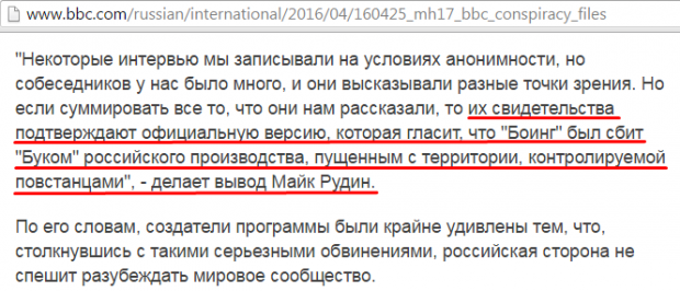 Редактор дает одобрямс, не смущаясь того, что фильм «Тайные файлы: Кто сбил борт МН 17?» является частью серии «Конспирологическое досье». Новость публикуется, а приподнятое настроение сопровождается мыслями: «От молодцы, би-би-си-шники! Все сделали за нас! Пора открывать шампанское!». И тут на тебе. Не долго музыка играла. «Бл*ть», - ощущая всю неловкость момента, проронил вслух российский пропагандист. BBC устами режиссера фильма внезапно уточняет, что «свидетельства подтверждают официальную версию, которая гласит, что «Боинг» был сбит «Буком» российского производства, пущенным с территории, контролируемой повстанцами». Тем временем многие россияне уже успели пообещать, что непременно посмотрят разрекламированный фильм. «Что же мы наделали?», – уже слышны истеричные вопли осознавших свою ошибку пропагандистов. Поздно пить боржоми – опростоволосились дальше некуда.