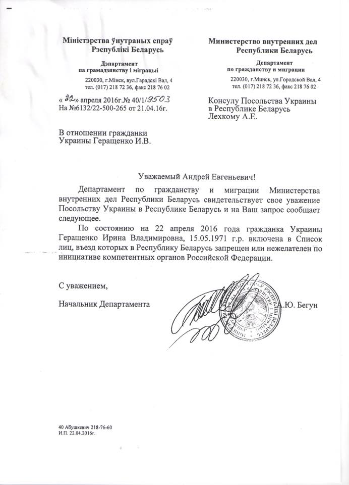 МЗС Украіни отримала дивний в своіх формулюваннях лист від МЗС Білорусі " В отношении гражданки Геращенко". Але ж мова не про " гражданку Геращенко", а першого віце - спікера ВР , офіційного представника Украіни в гуманітарній підгруппі.