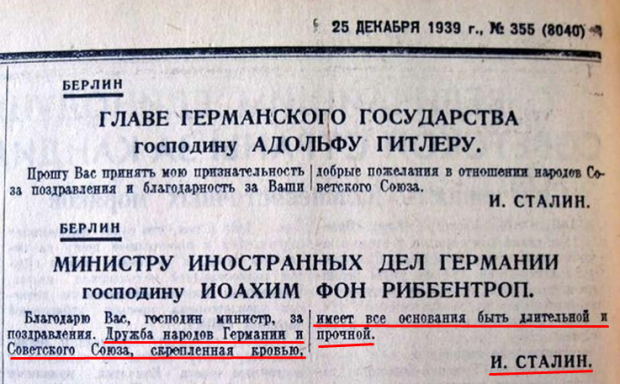 Скажи мне, кто твой друг, и я скажу, кто ты. Так вот, после событий 1 сентября 1939 года, то есть после формального начала Второй мировой войны, Сталин относился к Гитлеру по-приятельски в официальной коммуникации. Кто, Гитлер плохой? Да ладно. Какая фашистская Германия? О чем вы? Немцы как немцы. А товарищ Гитлер вообще поздравляет и говорит добрые пожелания в отношении народов Советского Союза.