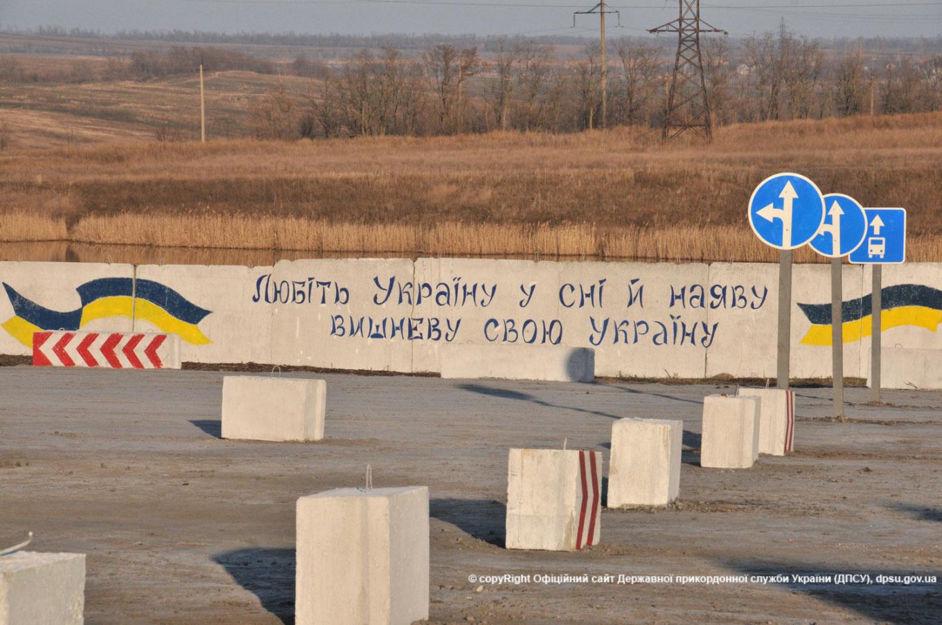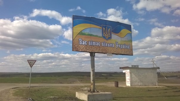 Выезжаем с территории пункта пропуска – радуют мотивирующие надписи: «Возвращайся в свободную Украину», строки из стихотворения Сосюры «Любіть Україну».