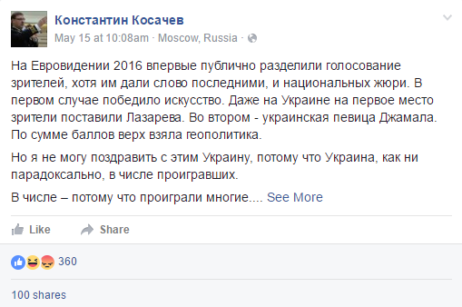 "На Евровидении 2016 впервые публично разделили голосование зрителей, хотя им дали слово последними, и национальных жюри. В первом случае победило искусство. Даже на Украине на первое место зрители поставили Лазарева. Во втором – украинская певица Джамала".