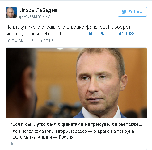 Я не могу судить, являлся ли наброс Лебедева и Маркина умышленной провокацией с целью подбодрить хулиганов и спровоцировать на новые вспышки насилия, или это было проявление слабоумия в чистом виде. По крайней мере, Лебедев капитально обгадился по поводу своего предшествующего призыва бить англичан спасать Россию, и с утра запел совершенно иные песни:
