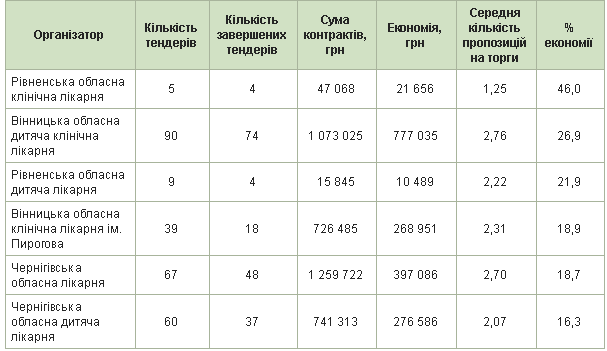 Для прикладу, Чернігівська обласна лікарня за півроку на ProZorro уклала контрактів на 1,2 млн грн за підсумками 48 тендерів. Це найбільший результат серед наведених нижче установ. Паралельно ця лікарня за аналогічний час за результатами надпорогових процедур уклала 21 угоду на 47,6 млн грн.