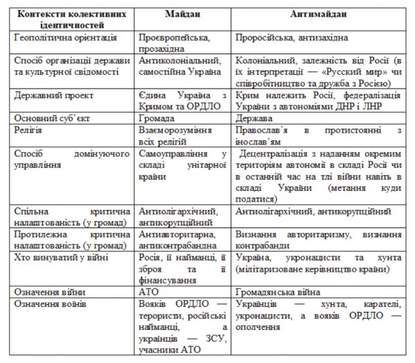 Водночас цінності Антимайдану не досліджені і не описані. Цінності Антимайдану традиційно протиставляються цінностям Майдану. Але в чому суть цього протиставлення, в системному вигляді зрозуміти важко.
