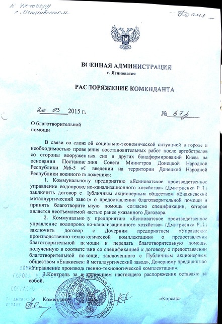 Но в марте 2015 Корсар еще был в городе хозяином. В своем распоряжении он предписывает коммунальному предприятию «Ясиноватское производственное объединение водопроводно-канализационного хозяйства» получить «благотворительную помощь» от Енакиевского металлургического завода, который принадлежит Ринату Ахметову.
