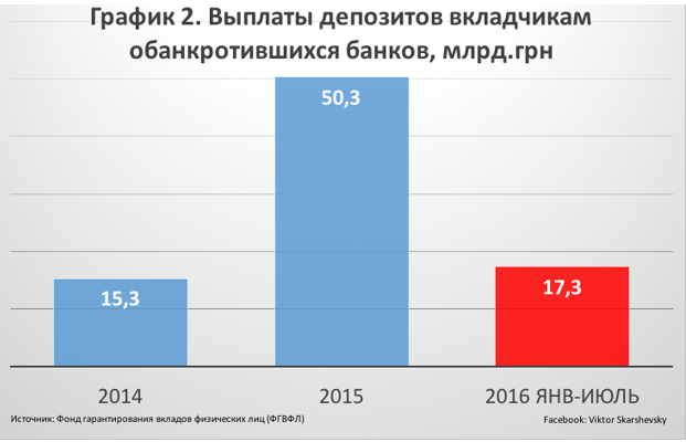 Подпитывают девальвацию гривны также выплаты депозитов вкладчикам обанкротившихся банков. По информации ФГВФЛ, за январь-июль 2016 года выплаты вкладчикам составили 17,3 млрд грн (на 2 млрд грн больше, чем за весь 2014 год) (см. График 2). Часть этих средств остается в банках, в то же время другая часть, конвертируется в иностранную валюту. По предварительным оценкам, в августе вкладчикам обанкротившихся банков было выплачено еще порядка 2 млрд грн. Есть все основания предполагать, что, на фоне начавшейся в августе девальвации, практически все эти средства были конвертированы в иностранную валюту.